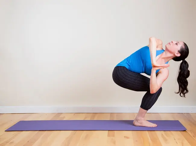 Stanite priljubljenih koljena i stopala. Savinite koljena i stopala kao da želite sjesti na stolicu. Spojite dlanove ispred srca (Anjali mudra) te rotirajte trup u lijevu stranu tako da desnim laktom pritisnete vanjsku stranu lijevog koljena. Pogled usmjerite prema gore i ostanite u ovom položaju pet do deset udaha i uzdaha, a zatim promijenite stranu.