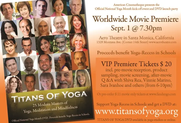 Titans of Yoga je dokumentarac o 25 prominentnih figura podučavanja joge i meditacije. Kroz ovaj dokumentarac oni dijele svoje inspirativne priče od trenutka kada su se susreli sa jogom do toga kako je praksa promijenila njihove živote na bolje. Njihove priče uključuju najčešće probleme s kojima se danas susrećemo – ovisnost i depresija, seksualne poremećaje i probleme s drogom. Kako dijele svoja iskustva, od tragičnih do komičnih situacija, ovih 25 učitelja vode nas na putovanje do samootkrivenja s kojima se svatko može poistovjetiti. Sudjeluju Seane Corn, Shiva Rea, Dr.Dean Ornish (lječnički savjetnik predsjednika Clintona) i Lilias Folan, prva dama joge.