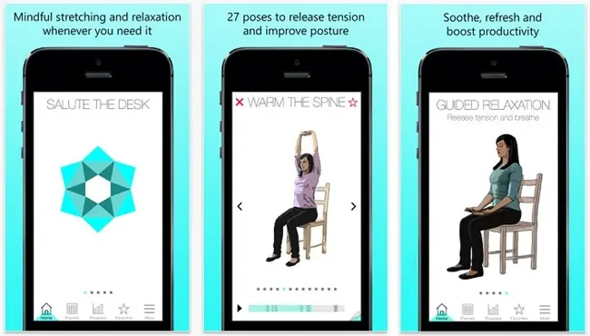 Ova aplikacija je posebna jer se izvodi u sjedećem položaju i idealna je za izvođenje na radnom mjestu, iako ju možete koristiti i kod kuće, na putovanju i sličnim situacijama s ograničenom pokretljivošću.Osim 27 rsazličitih asana, nudi i mogućnost vođenog opuštanja, tako da će vam ova aplikacija pomoći da se suočite sa stresom i mentalno i fizički. Sadrži više od dva sata audio instrukcija, video demonstracija i detaljnih tekstualnih objašnjenja. Nudi i mogućnost praćenja svog napretka, dijeljenja na društvenim mrežama i podsjetnik.