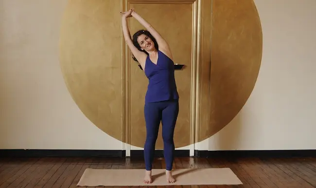 Iz Tadasane, udahnite i dignite ruke iznad glave. Izdahnite i nagnite se na jednu stranu.