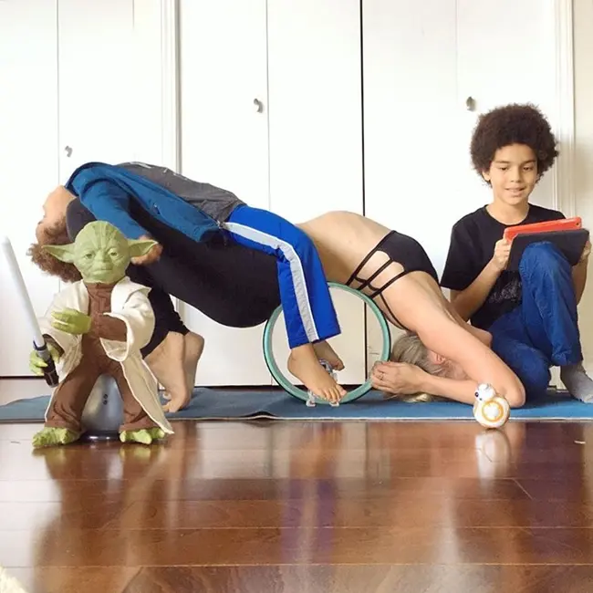 Većina asana je ionako teška za izvesti, a neke su još teže kada je dodana težina njezina dva sina.