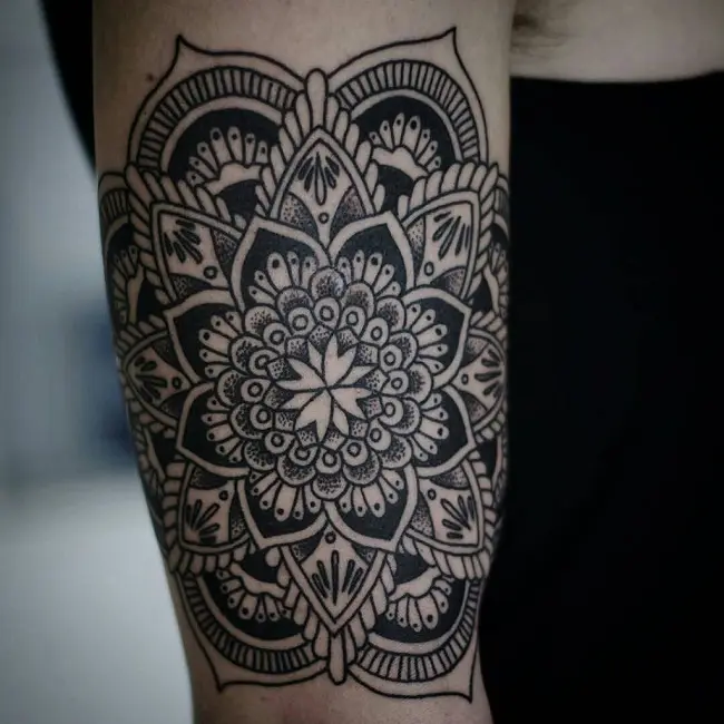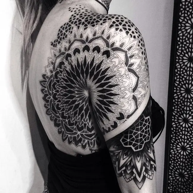 Mandala, koja se često koristi kao objekt fokusa u meditaciji, prekrasan je geometrijski uzorak koji predstavlja kozmički sklad metafizičkog svemira čiji se putevi sreću u središtu. Mnogi složeni dijelovi i detalji čine svojim spojem mandalu cijelom čime ona postaje simbol jedinstva, savršenstva i cjelovitosti. Mandala također predstavlja lotos u punom cvatu s laticama širom otvorenih prema svijetu. Tetovaže mandala su nerijetko komplicirane, ali zato su i jedinstvene baš poput svakog čovjeka.