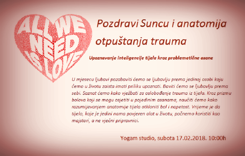 U subotu, 17.veljače u joga studiju Yogam održat će se radionica tijekom koje će se baviti ljubavlju prema jedinoj osobi koju ćete u životu zaista imati priliku upoznati. Baviti ćete se ljubavlju prema sebi. Saznat ćete kako vježbati za oslobođenje trauma iz tijela.