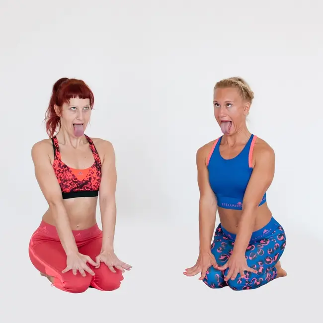 3. Udahnuti i na izdah spustiti bradu na prsa, isplaziti jezik što više prema bradi uz zvuk glasnog izdaha kroz usta, pogled između obrva, prste na rukama aktivno raširiti (predstavljaju lavlje pandže)