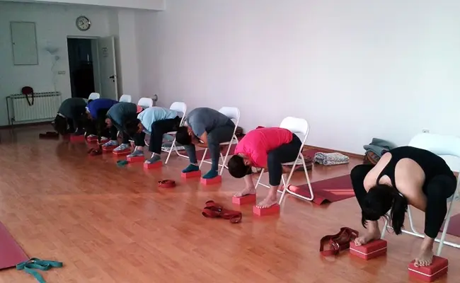 Ovakva praksa i uključuje korištenje pomagala – cigli, remenja, stolica, špaga – koja omogućuju dublja istezanja te služe kao pomoć pri izvođenju asana koje djeluju terapeutski na tijelo i um. Uz pomagala možemo dublje ući u asanu ali i opustiti napete tjelesne strukture.